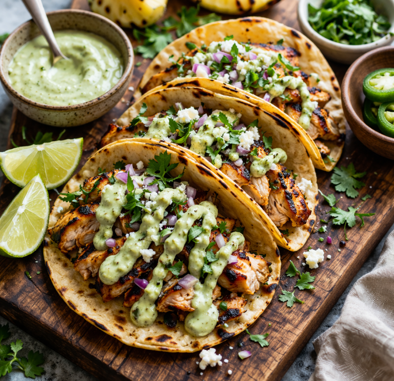 Grilled Chili Lime Chicken Tacos with Avocado Crema